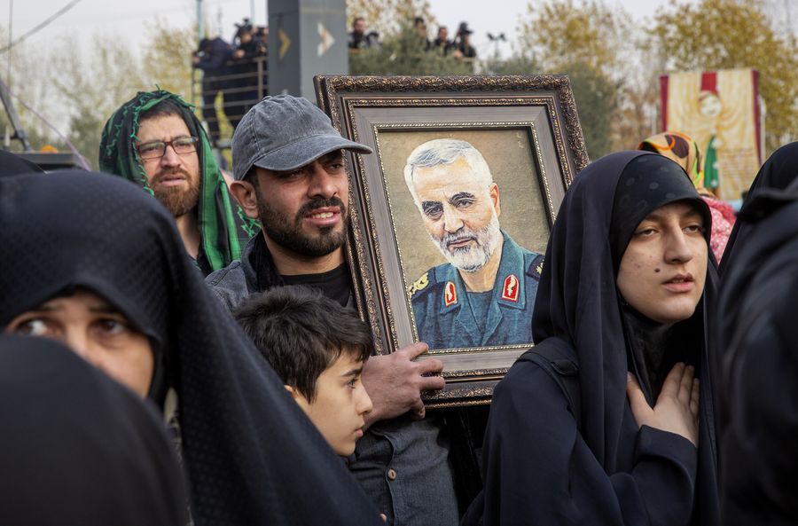 A man holds a picture of top Iranian commander Qasem Soleimani during a protest in Tehran, Iran, on Jan. 3, 2020. (Photo by Ahmad Halabisaz/Xinhua)