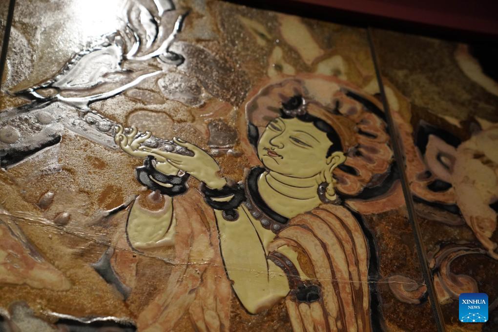 This photo taken on Dec. 19, 2025 shows a ceramic artwork related to Dunhuang murals during the "Dunhuang in Glazes" exhibition at the Jiangxi provincial art museum, in Nanchang, east China's Jiangxi Province. (Xinhua/Zhou Mi)