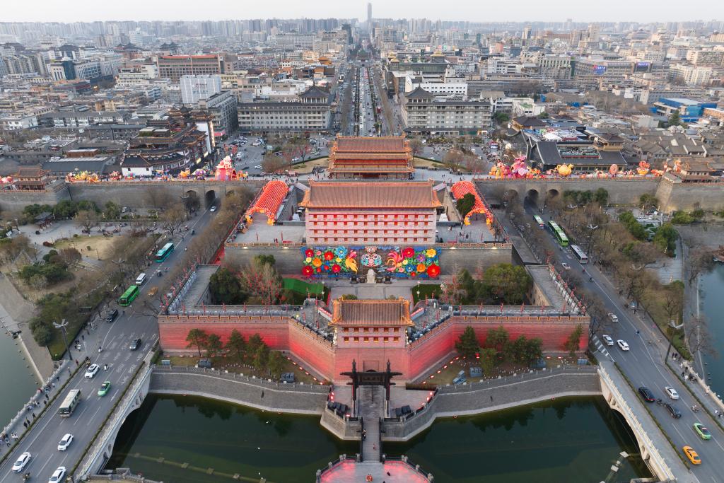 An aerial drone photo taken on March 19, 2025 shows the Yongning Gate of the Xi'an City Wall in Xi'an, northwest China's Shaanxi Province. (Xinhua/Shao Rui)
