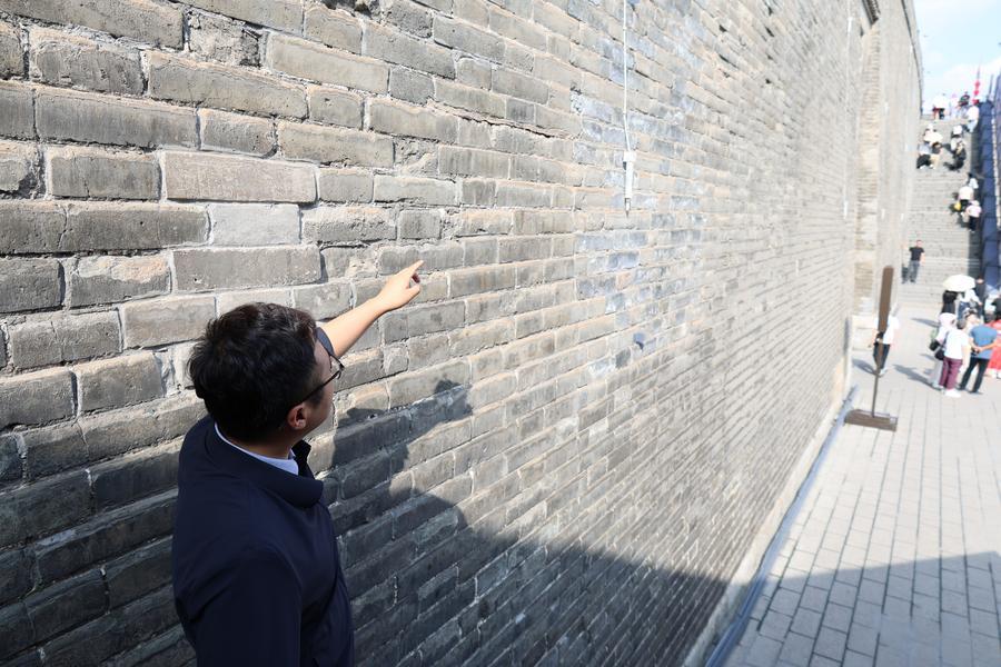 An inspector measures the length of a crack on Xi'an City Wall in Xi'an, northwest China's Shaanxi Province, Sept. 10, 2025. (Xinhua/Zhu Weixi)