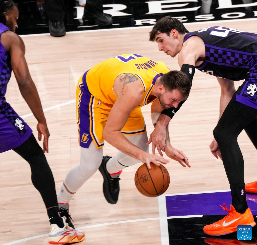 Los Angeles Lakers' Luka Doncic (C) competes during the 2025-2026 NBA regular season game between Sacramento Kings and Los Angeles Lakers in Sacramento, the United States, on Jan. 12, 2026. (Photo by Sun Yuxuan/Xinhua)