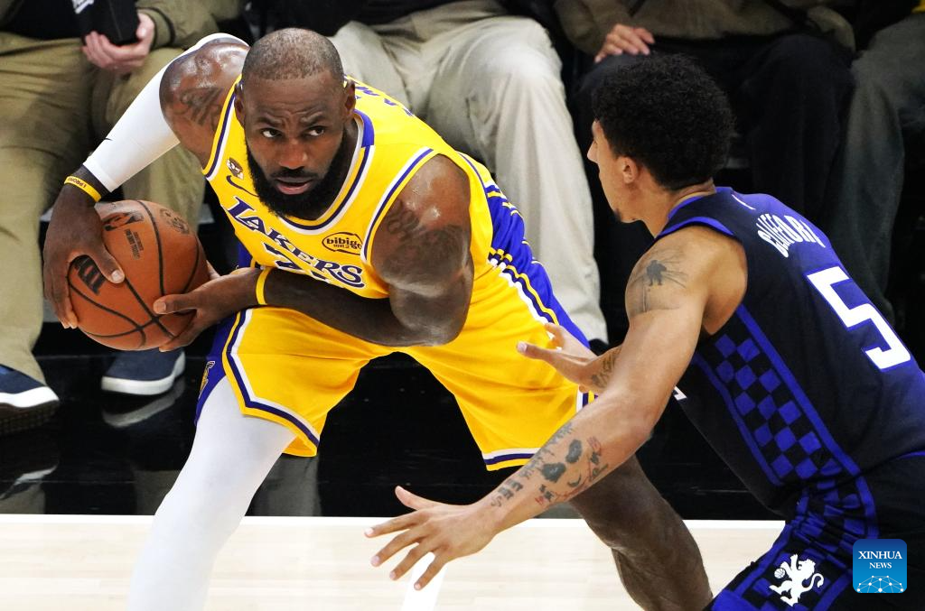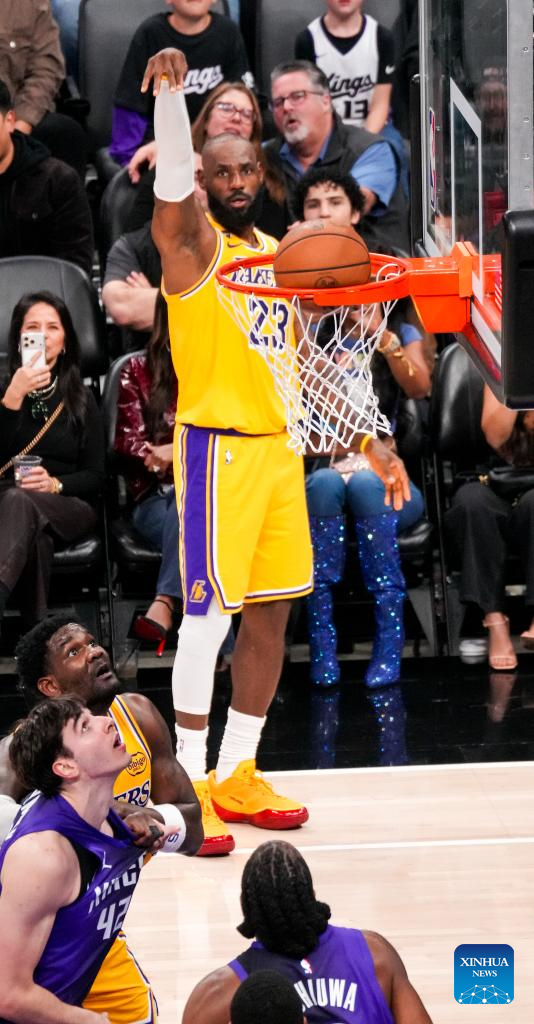 Los Angeles Lakers' LeBron James (L) competes during the 2025-2026 NBA regular season game between Sacramento Kings and Los Angeles Lakers in Sacramento, the United States, on Jan. 12, 2026. (Xinhua/Wu Xiaoling)