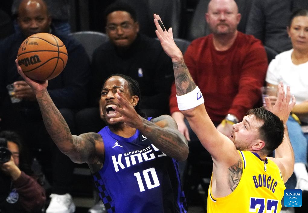 Sacramento Kings' DeMar DeRozan (L) competes during the 2025-2026 NBA regular season game between Sacramento Kings and Los Angeles Lakers in Sacramento, the United States, on Jan. 12, 2026. (Xinhua/Wu Xiaoling)