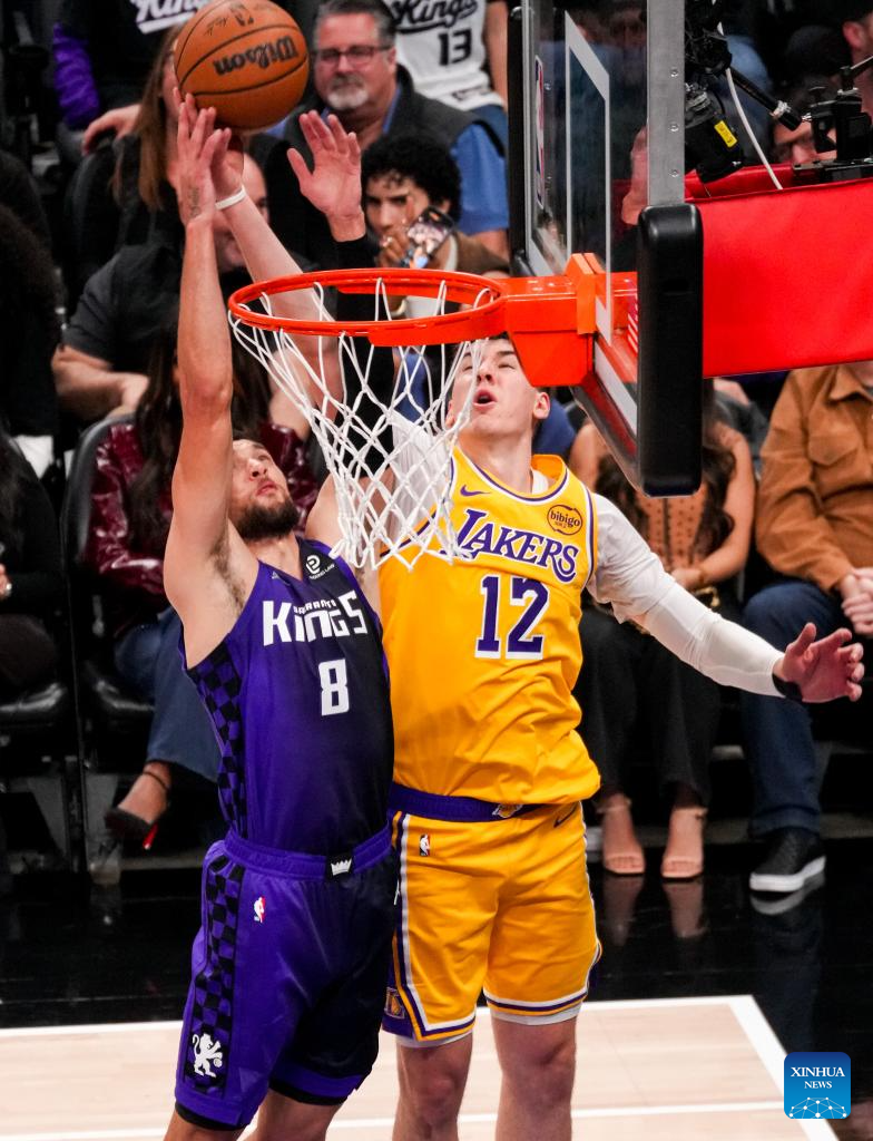 Los Angeles Lakers' Jake LaRavia (R) vies with Sacramento Kings' Zach LaVine during the 2025-2026 NBA regular season game between Sacramento Kings and Los Angeles Lakers in Sacramento, the United States, on Jan. 12, 2026. (Photo by Sun Yuxuan/Xinhua)