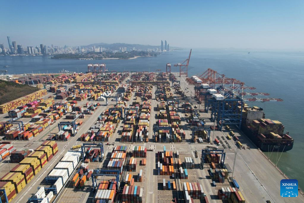 An aerial drone photo taken on Jan. 14, 2026 shows cargo ships loading and unloading containers at a container terminal in Xiamen, southeast China's Fujian Province. (Photo by Zeng Demeng/Xinhua)