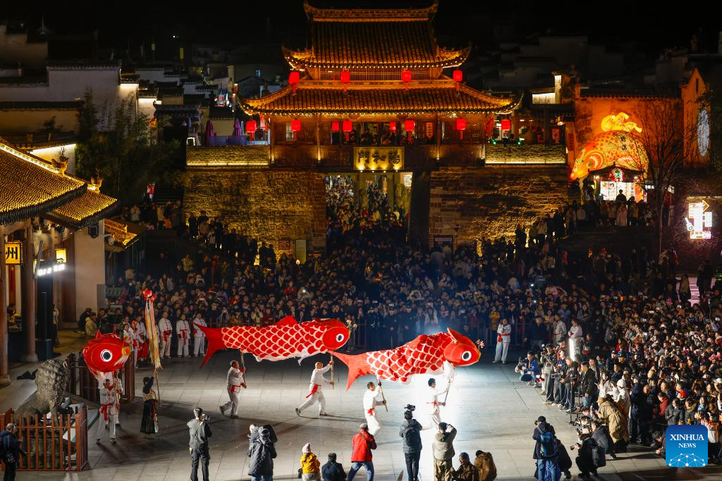 People watch a fish-shaped lanterns performance in Shexian County, Huangshan City of east China's Anhui Province, Feb. 4, 2026. (Photo by Shi Yalei/Xinhua)