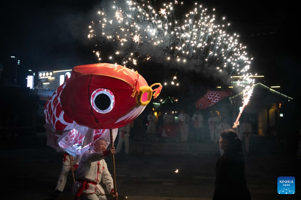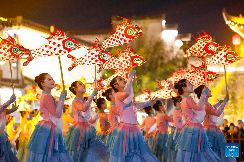 Performers holding fish-shaped lanterns perform in Shexian County, Huangshan City of east China's Anhui Province, Dec. 19, 2025. (Photo by Shi Yalei/Xinhua)