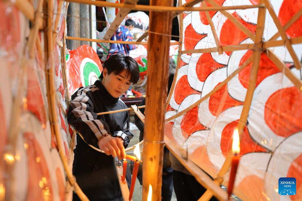 Villagers make fish-shaped lanterns in Zhanqi Village, Shexian County of Huangshan City, east China's Anhui Province, March 1, 2026. (Xinhua/Zhang Duan)