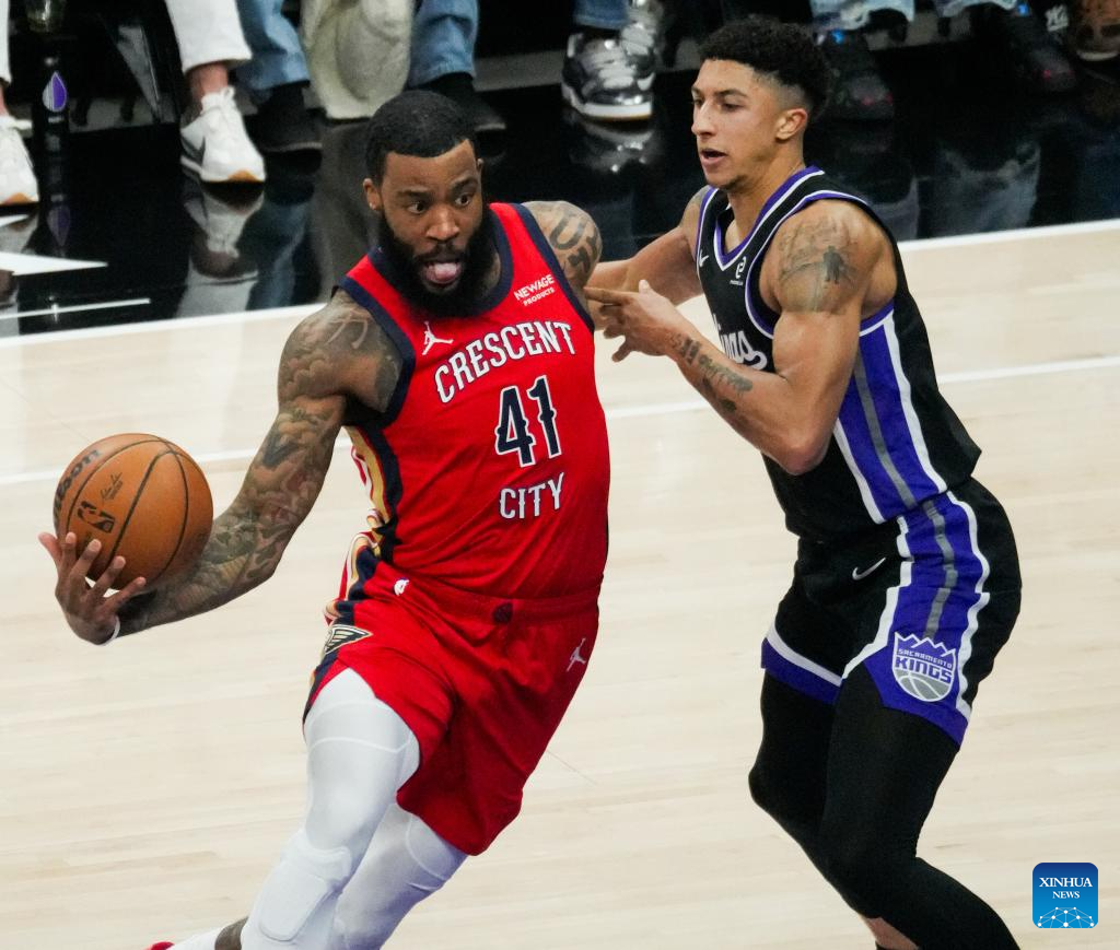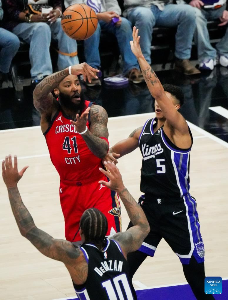 Saddiq Bey (top L) of New Orleans Pelicans passes the ball during the 2025-2026 NBA regular season basketball game between New Orleans Pelicans and Sacramento Kings in Sacramento, the United States, March 5, 2026. (Photo by Sun Yuxuan/Xinhua)