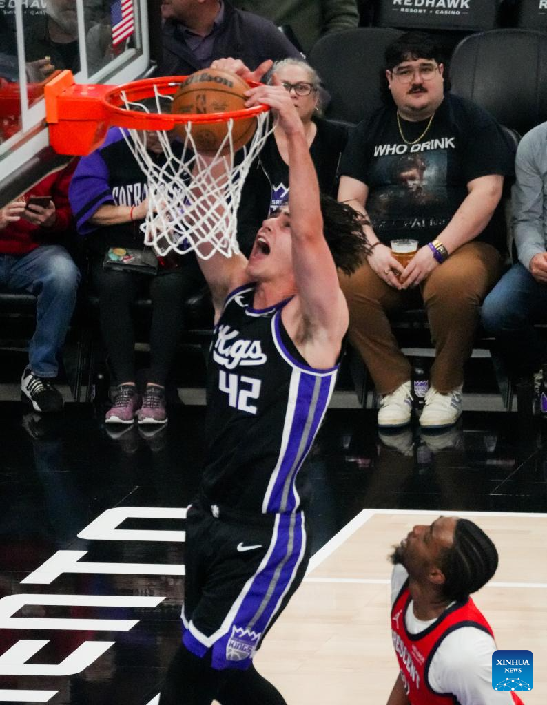 Maxime Raynaud (top) of Sacramento Kings dunks during the 2025-2026 NBA regular season basketball game between New Orleans Pelicans and Sacramento Kings in Sacramento, the United States, March 5, 2026. (Photo by Sun Yuxuan/Xinhua)