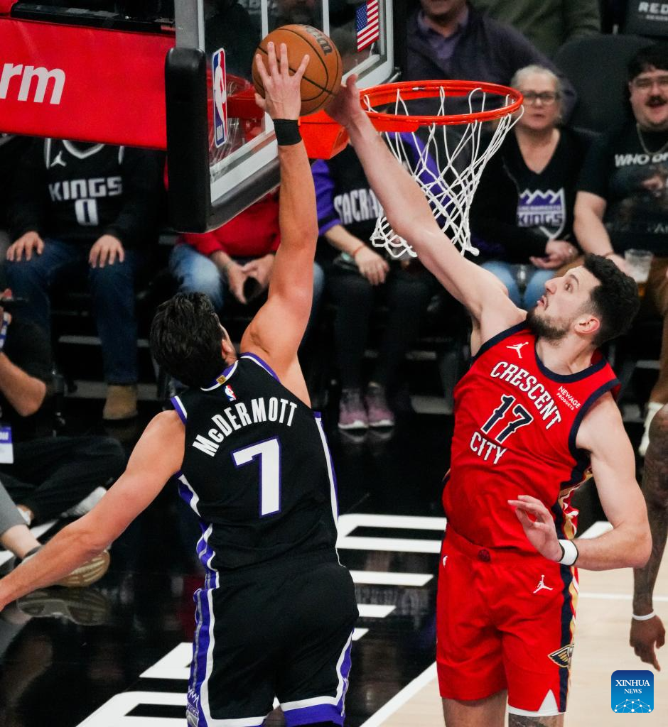 Karlo Matkovic (R) of New Orleans Pelicans blockes Doug McDermott of Sacramento Kings during the 2025-2026 NBA regular season basketball game between New Orleans Pelicans and Sacramento Kings in Sacramento, the United States, March 5, 2026. (Photo by Sun Yuxuan/Xinhua)