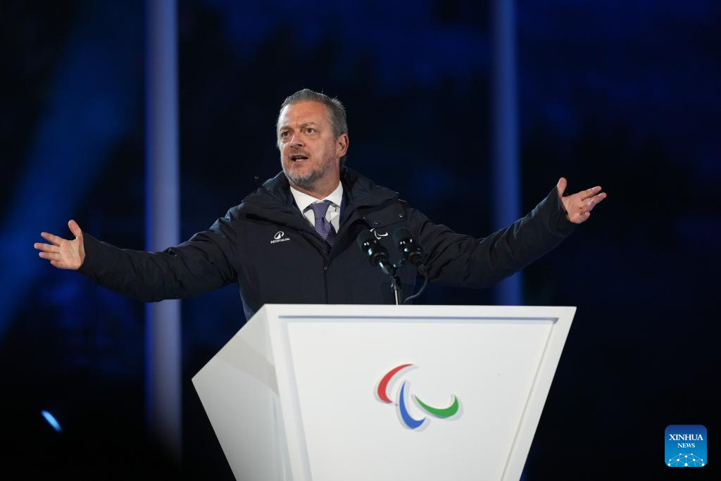 International Paralympic Committee President Andrew Parsons delivers a speech during the opening ceremony of Milan-Cortina 2026 Paralympic Winter Games at Verona Olympic Arena in Verona, Italy, March 6, 2026. (Xinhua/Li Jing)