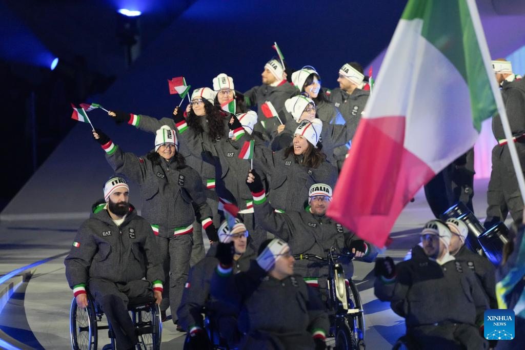 Members of the delegation of Italy parade during the opening ceremony of Milan-Cortina 2026 Paralympic Winter Games at Verona Olympic Arena in Verona, Italy, March 6, 2026. (Xinhua/Li Jing)