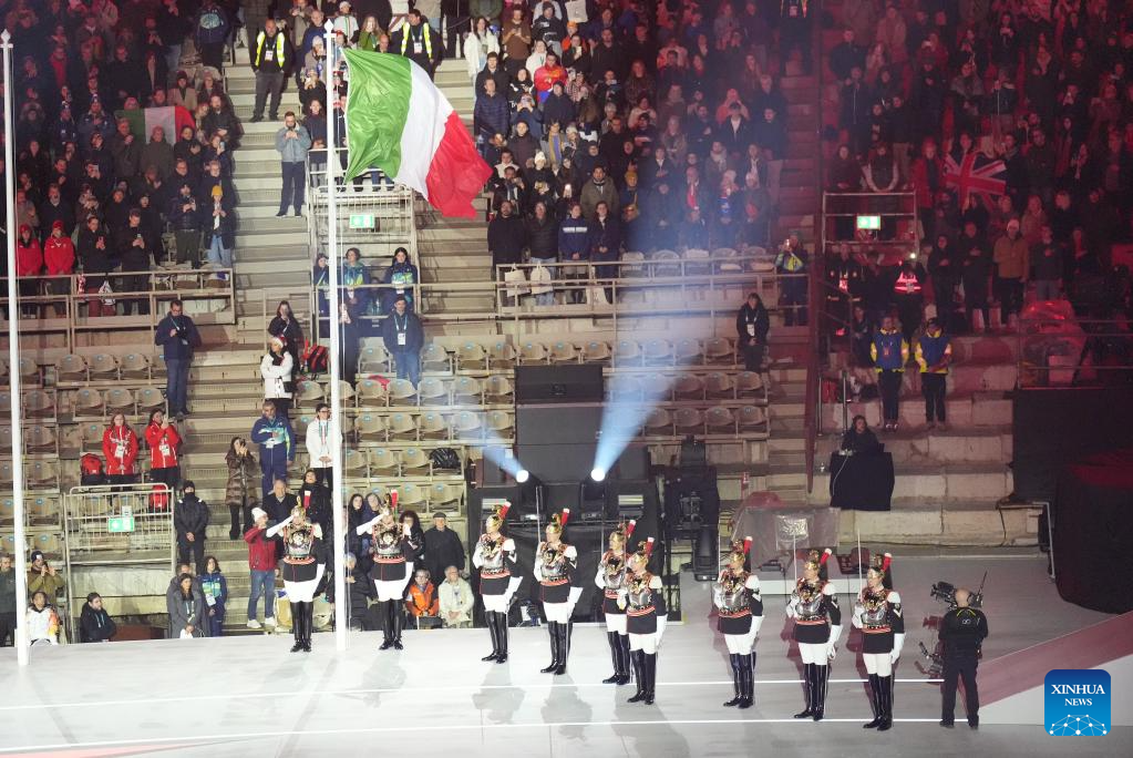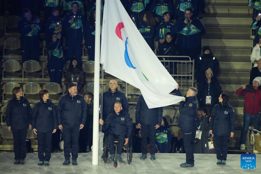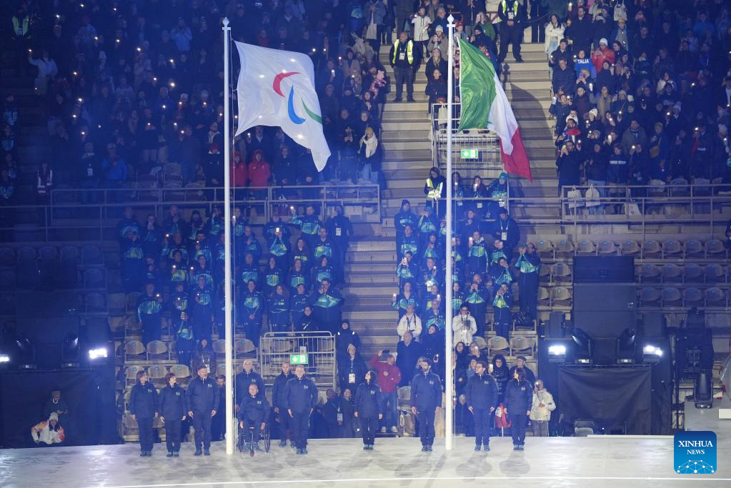 Italian national flag is raised during during the opening ceremony of Milan-Cortina 2026 Paralympic Winter Games at Verona Olympic Arena in Verona, Italy, March 6, 2026. (Xinhua/Hou Jun)