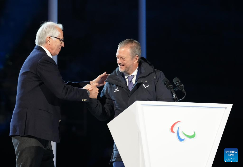 Milan-Cortina 2026 Organising Committee President Giovanni Malago (L) shakes hands with International Paralympic Committee President Andrew Parsons during the opening ceremony of Milan-Cortina 2026 Paralympic Winter Games at Verona Olympic Arena in Verona, Italy, March 6, 2026. (Xinhua/Li Jing)