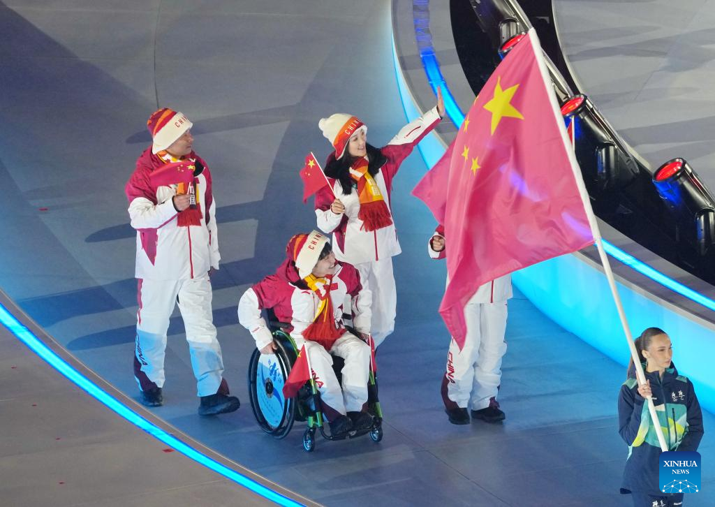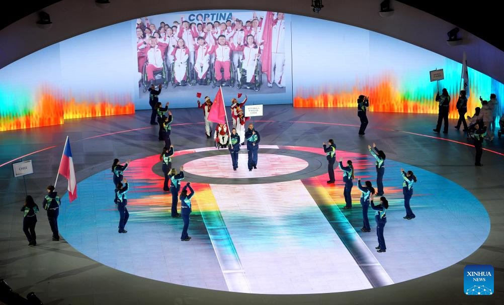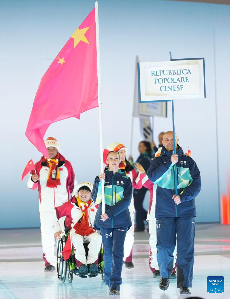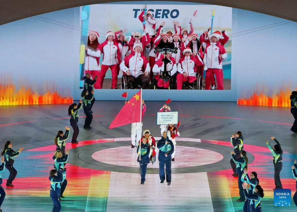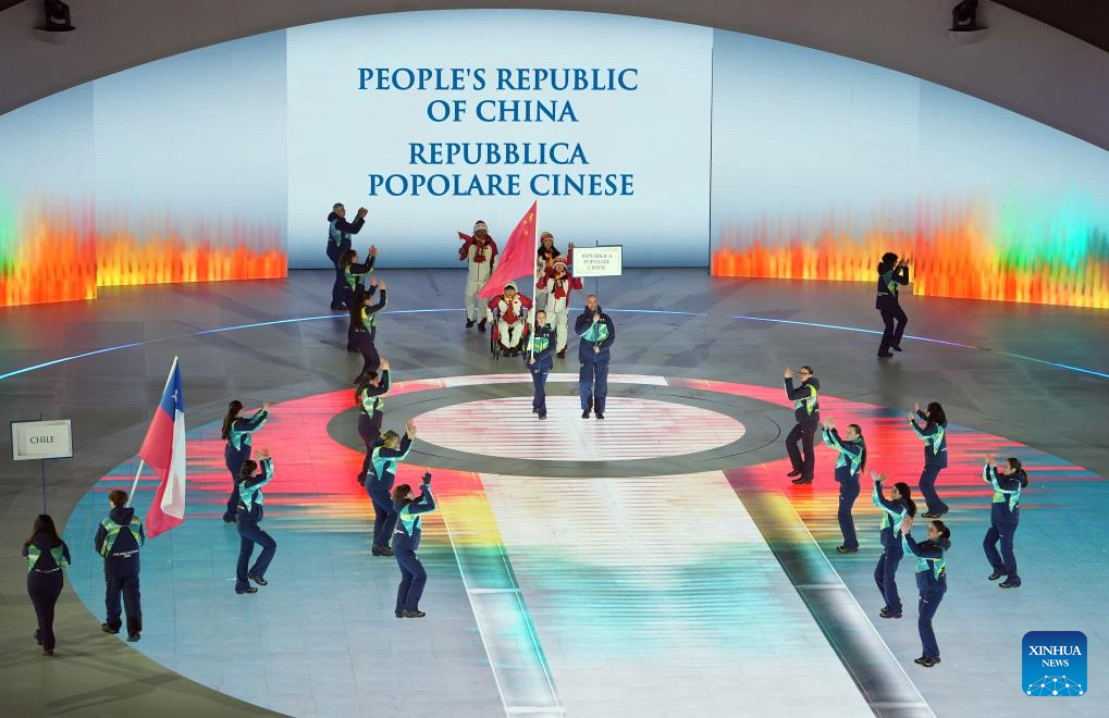 Members of the delegation of China parade during the opening ceremony of Milan-Cortina 2026 Paralympic Winter Games at Verona Olympic Arena in Verona, Italy, March 6, 2026. (Xinhua/Li Jing)