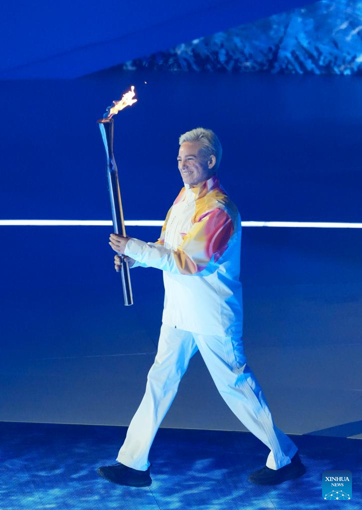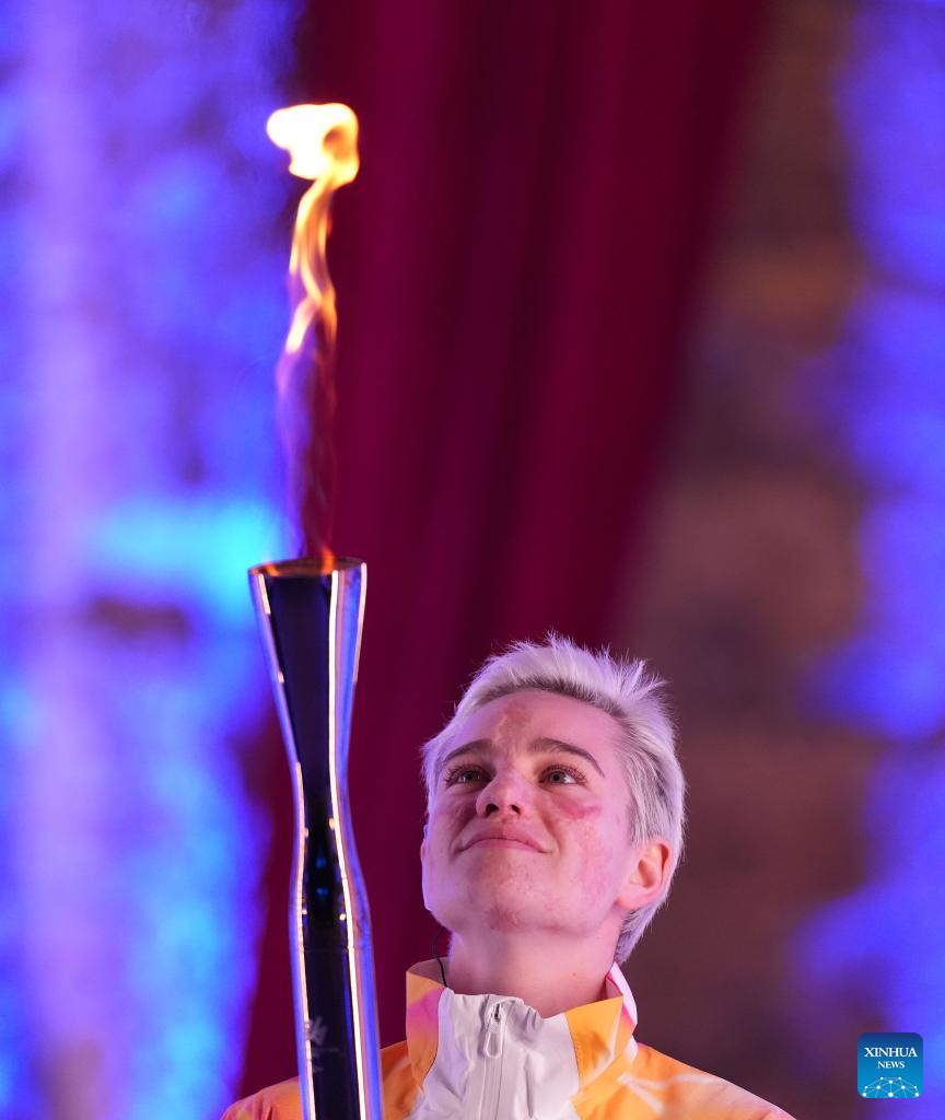 Torchbearer Bebe Vio is seen during the opening ceremony of Milan-Cortina 2026 Paralympic Winter Games at Verona Olympic Arena in Verona, Italy, March 6, 2026. (Xinhua/Li Jing)