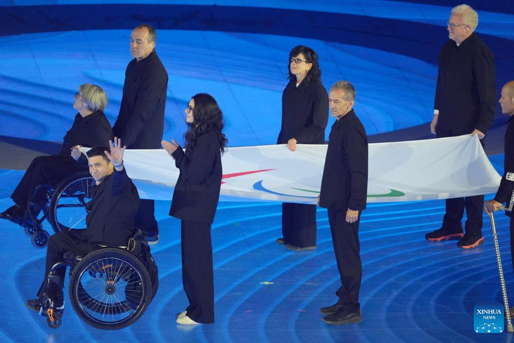 The Paralympic flag is carried onto the stage during the opening ceremony of Milan-Cortina 2026 Paralympic Winter Games at Verona Olympic Arena in Verona, Italy, March 6, 2026. (Xinhua/Cai Yang)