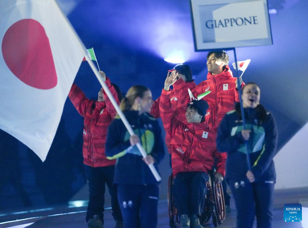 Members of the delegation of Japan parade during the opening ceremony of Milan-Cortina 2026 Paralympic Winter Games at Verona Olympic Arena in Verona, Italy, March 6, 2026. (Xinhua/Li Jing)