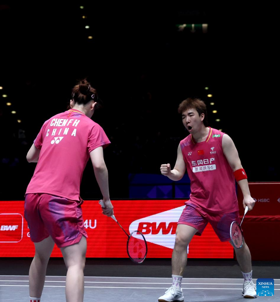 Guo Xinwa (R)/Chen Fanghui celebrate scoring during the mixed doubles semifinal between Guo Xinwa/Chen Fanghui of China and Thom Gicquel/Delphine Delrue of France at the All England Open Badminton Championships 2026 in Birmingham, Britain, March 7, 2026. (Xinhua/Li Ying)