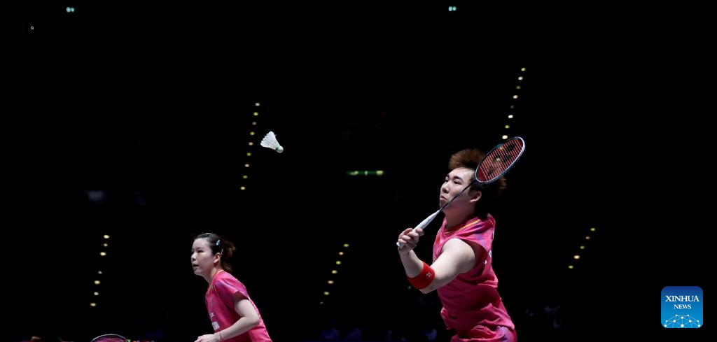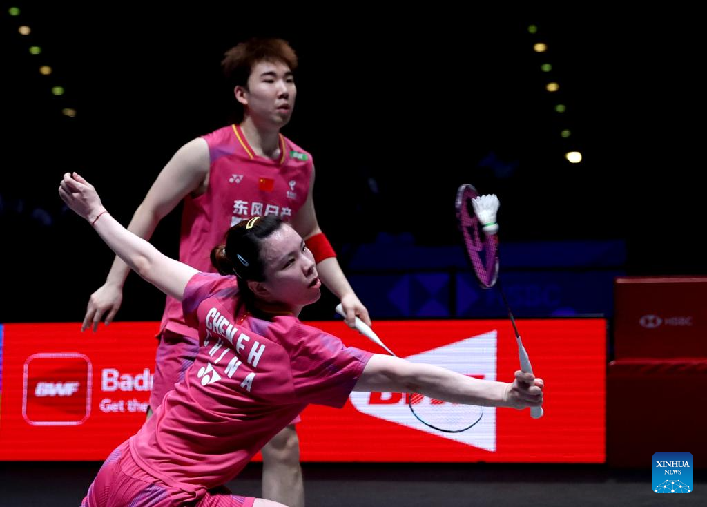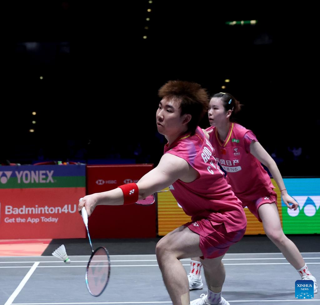 Guo Xinwa (R)/Chen Fanghui compete during the mixed doubles semifinal between Guo Xinwa/Chen Fanghui of China and Thom Gicquel/Delphine Delrue of France at the All England Open Badminton Championships 2026 in Birmingham, Britain, March 7, 2026. (Xinhua/Li Ying)