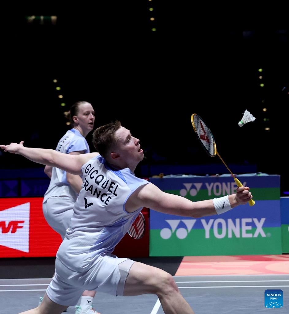 Thom Gicquel (front)/Delphine Delrue compete during the mixed doubles semifinal between Guo Xinwa/Chen Fanghui of China and Thom Gicquel/Delphine Delrue of France at the All England Open Badminton Championships 2026 in Birmingham, Britain, March 7, 2026. (Xinhua/Li Ying)