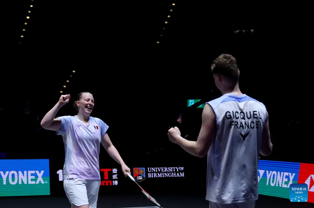 Thom Gicquel/Delphine Delrue (L) celebrate after winning the mixed doubles semifinal between Guo Xinwa/Chen Fanghui of China and Thom Gicquel/Delphine Delrue of France at the All England Open Badminton Championships 2026 in Birmingham, Britain, March 7, 2026. (Xinhua/Li Ying)