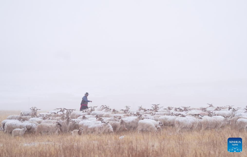 A shepherd herds livestock in the snow in Qilian County of Haibei Tibetan Autonomous Prefecture, northwest China's Qinghai Province, March 8, 2026. (Xinhua/Zhang Long)