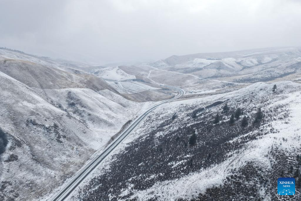 This aerial photo taken on March 8, 2026 shows snow scenery in Qilian County of Haibei Tibetan Autonomous Prefecture, northwest China's Qinghai Province. (Xinhua/Zhang Long)