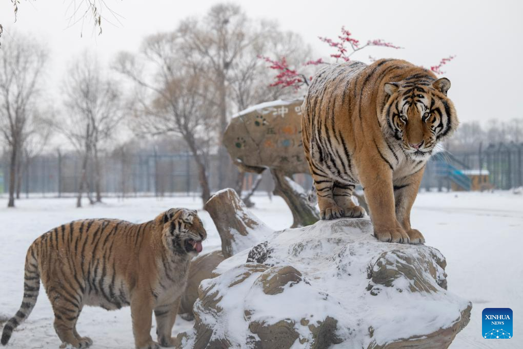 This photo taken on Jan. 12, 2026 shows tigers at the snow-covered Siberian Tiger Park in Harbin, northeast China's Heilongjiang Province. Harbin saw snowfall recently, which added a touch of winter charm to its Siberian Tiger Park. (Xinhua/Wang Zuo)