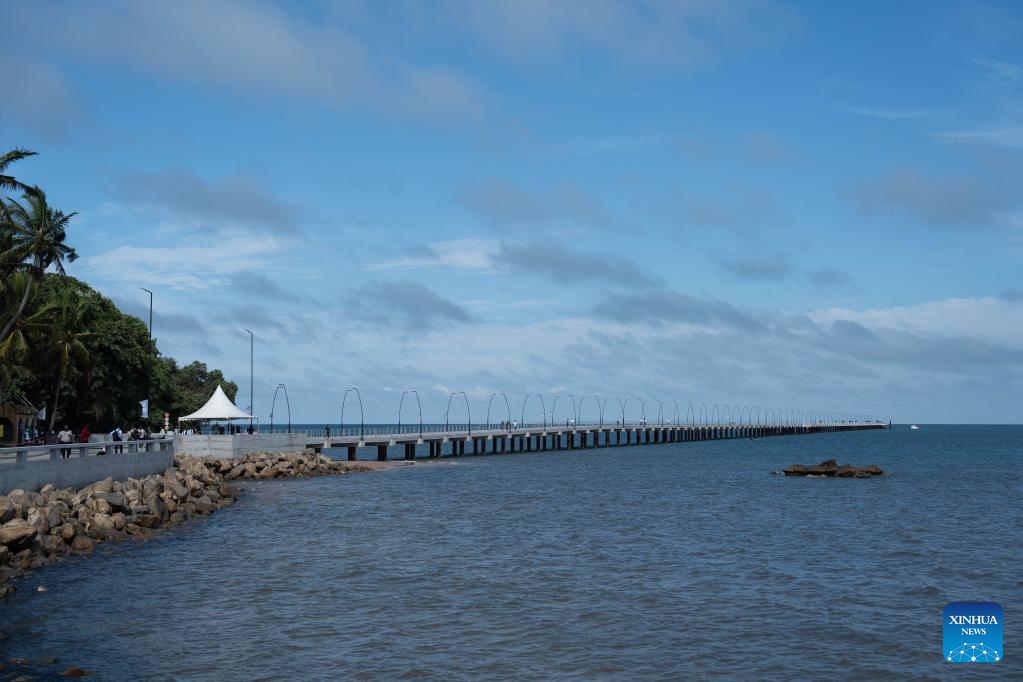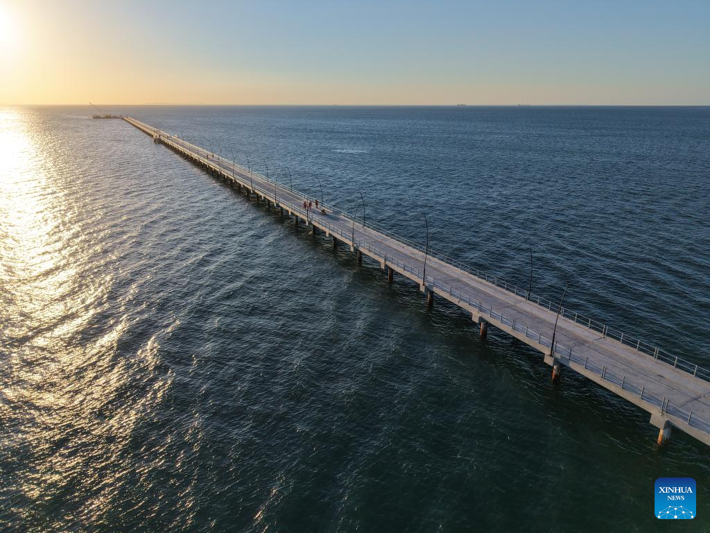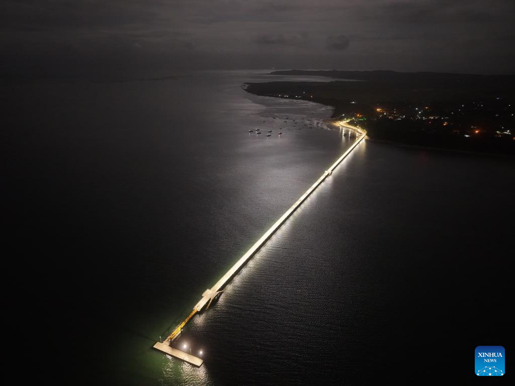 An aerial drone photo taken on March 4, 2026 shows the jetty bridge built by China Road and Bridge Corporation on Inhaca Island in Maputo Bay, Mozambique. The newly completed jetty bridge, with a total length of about 1.3 km, allows passenger vessels to dock under different tidal conditions. Visitors can now reach the island directly via the jetty, improving the safety and efficiency of passenger transport. (China Road and Bridge Corporation/Handout via Xinhua)