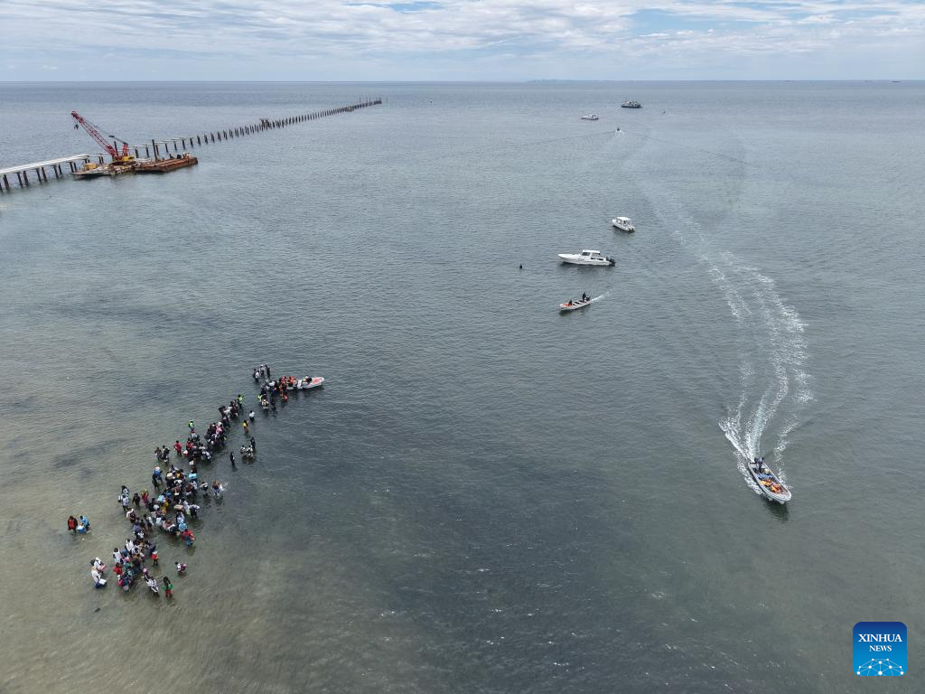 An aerial drone photo taken on Jan. 3, 2026 shows local residents and tourists wading through seawater to board boats before the completion of the jetty bridge built by China Road and Bridge Corporation on Inhaca Island in Maputo Bay, Mozambique. The newly completed jetty bridge, with a total length of about 1.3 km, allows passenger vessels to dock under different tidal conditions. Visitors can now reach the island directly via the jetty, improving the safety and efficiency of passenger transport. (China Road and Bridge Corporation/Handout via Xinhua)