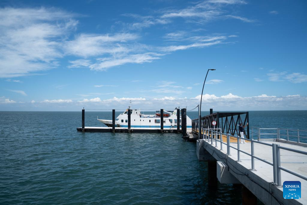 This photo taken on March 6, 2026 shows the jetty bridge built by China Road and Bridge Corporation on Inhaca Island in Maputo Bay, Mozambique. The newly completed jetty bridge, with a total length of about 1.3 km, allows passenger vessels to dock under different tidal conditions. Visitors can now reach the island directly via the jetty, improving the safety and efficiency of passenger transport. (Xinhua/Liu Jie)