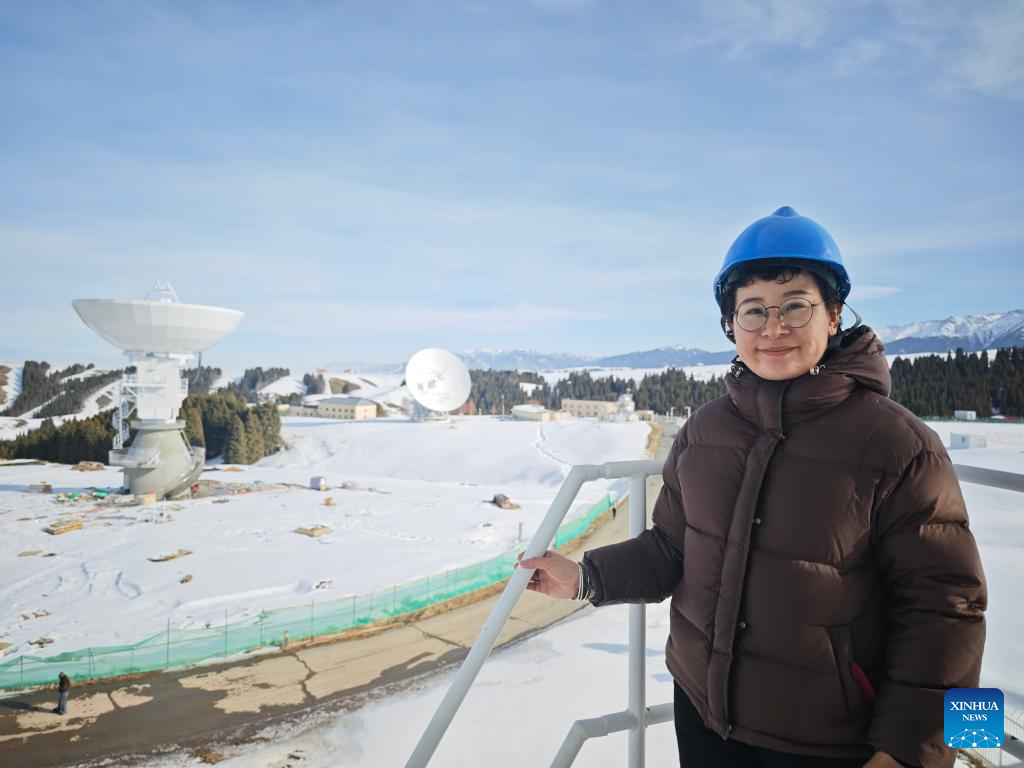 Guljaina Kazezkhan poses for photos at Nanshan Station of the Xinjiang Astronomical Observatory under the Chinese Academy of Sciences, in Urumqi, northwest China's Xinjiang Uygur Autonomous Region, Feb. 11, 2026. (Xinhua/Jia Zhao)