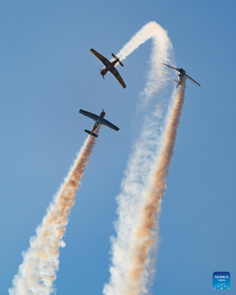 Aircraft perform during the exhibition and air show to mark the 75th anniversary of the Sri Lanka Air Force in Colombo, Sri Lanka, on March 6, 2026. (Photo by Thilina Kaluthotage/Xinhua)