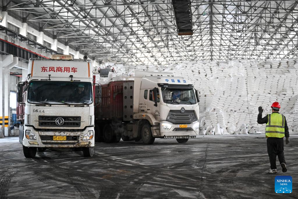 Trucks wait for loading at a fertilizer company in Manas County of Changji Hui Autonomous Prefecture, northwest China's Xinjiang Uygur Autonomous Region, on March 5, 2026. Agricultural supply manufacturers in Xinjiang are working at full capacity to fulfill orders and ensure a steady flow of fertilizers and materials for spring farming.