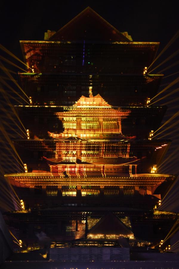 這是1月3日在蘭州黃河樓景區拍攝的《大有蘭州》光影秀。