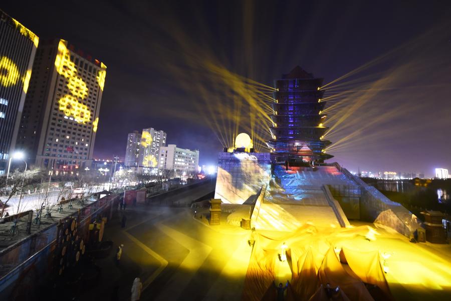 ??? 這是1月3日在蘭州黃河樓景區拍攝的《大有蘭州》光影秀。