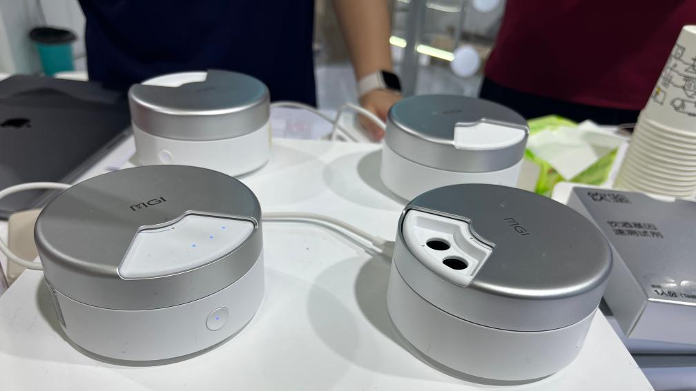 在华大集团展台,一款饮酒能力基因测序仪吸引参展观众围观体验。