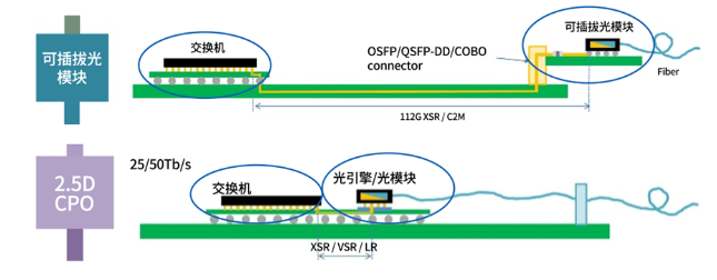 光电转换,以前采用的传统技术——可插拔方案。这项技术中,光模块和交换芯片的距离相隔比较远,如下图所示,光模块“独立外设”,通过接口与交换机相连,就好比他俩像在“异地办公”,有啥需要沟通传输的,还要靠“打电话”,信息传到对方的效率相对较慢,而CPO技术,采用“封装”的方式,把两者封装在一块基板上,拉近两者的距离,相当于从之前的“异地办公”,变成现在两者坐在旁边的“同桌协作”,有点啥事情,沟通起来效率更高,更省力,也就实现了更低时延、损耗和功耗。