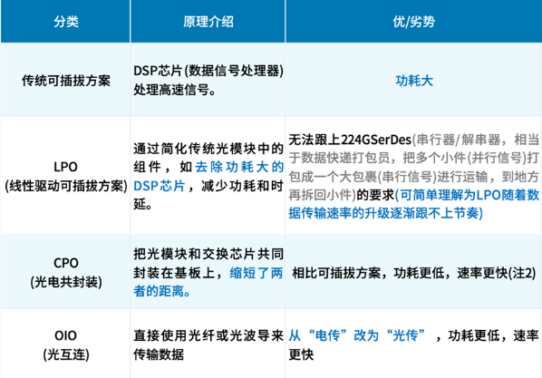 表 传统可插拔方案、LPO、CPO、OIO对比