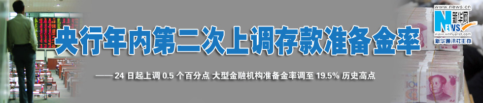 本次上調大約可凍結商業銀行資金逾3500億元。至此,大型商業銀行準備金率達19.5%的歷史新高位。 [詳細]