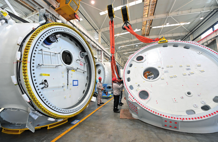 工人在位于山西转型综合改革示范区的太重集团新能源产业园区吊运风电装备(2025年9月24日摄) 杨晨光摄/本刊