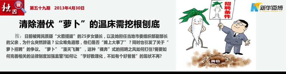 拔“蘿卜”更需祛“污泥” 對曝光的類似事件不能僅僅停留在“補改撤銷”的層面,更多的是對耍“特權(quán)”、打“親情牌”、用公權(quán)辦私事者的嚴(yán)格問責(zé),杜絕補改、撤銷招聘淪為一些人的免責(zé)“擋箭牌”,發(fā)現(xiàn)一起、查處一起。