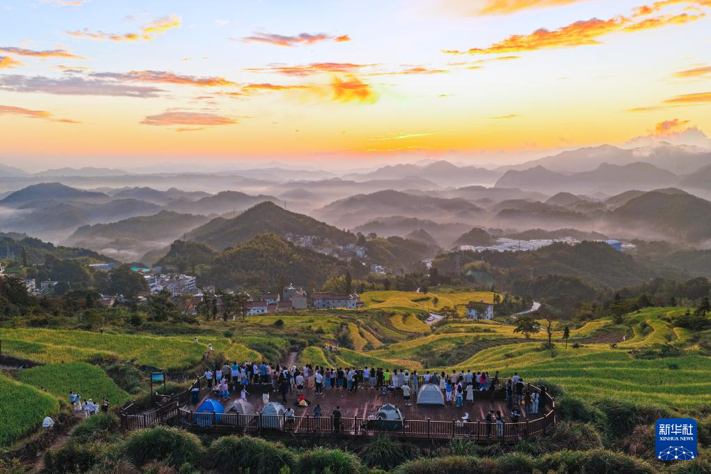 10月4日清晨,游客聚集在浙江省台州市天台县泳溪乡北山村的鎏金梯田观景台拍摄日出(无人机照片)。