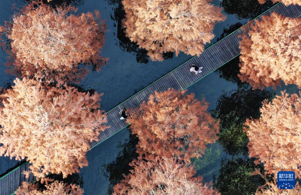12月10日,游客在湖南省衡阳市雁峰区岳屏镇隆桥村的水杉林休闲游玩(无人机照片)。