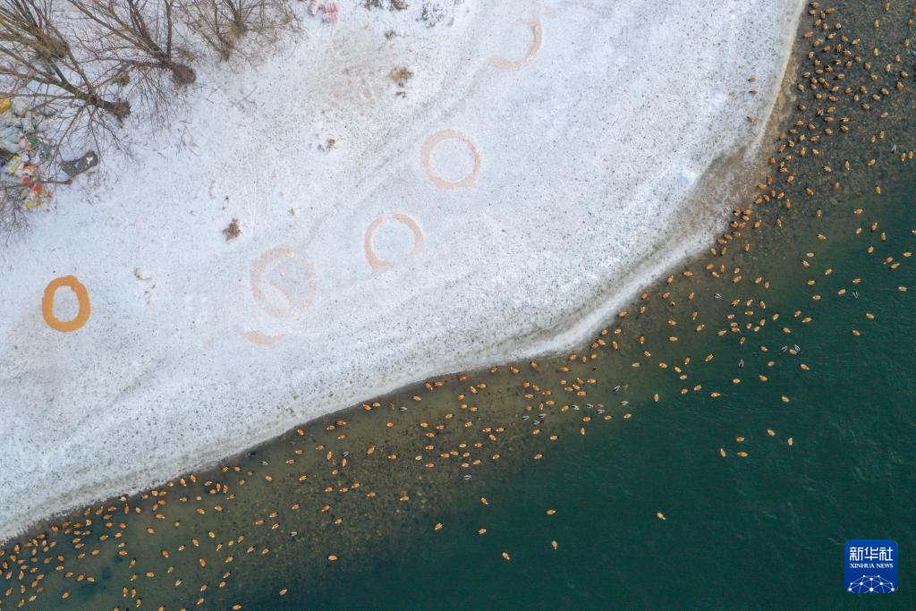 1月28日,众多鸟类在长白岛水中栖息,岸边是护鸟人王婷婷投放的鸟食(无人机照片)。