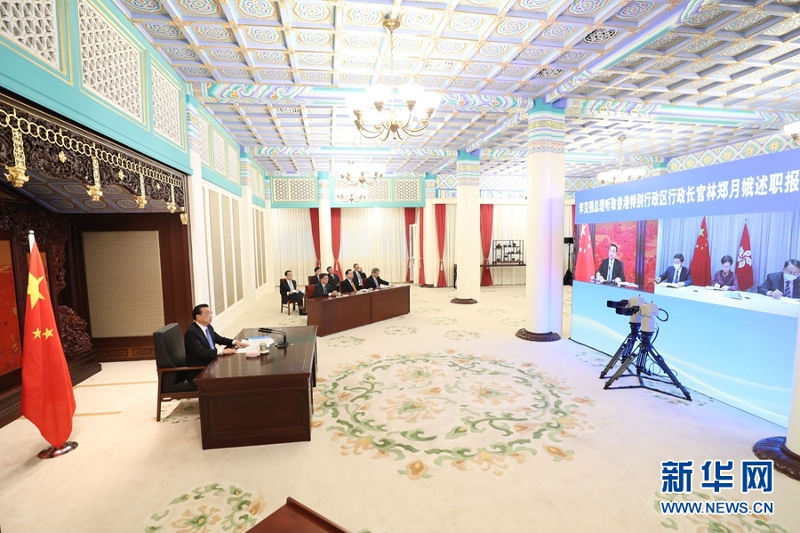 1月27日,國務院總理李克強在北京中南海紫光閣以視頻連線方式聽取香港特別行政區行政長官林鄭月娥2020年度的述職報告。國務院副總理韓正出席。新華社記者 王曄 攝