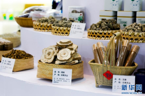 在第9届中国—南亚博览会上,中药材产业馆云南文山展区陈列的中药材。新华网发(刘云 摄)