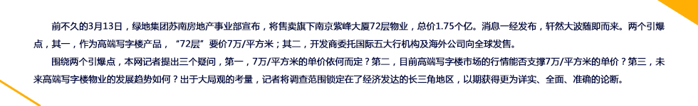 戴德梁行華東區(qū)寫字樓部董事沈潔表示,南京超甲級寫字樓的最高租金報價為5.5-6元/平方米/天,無法支持7萬/平方米的售價,所以“該價格不具有參考意義”。…[詳細(xì)]